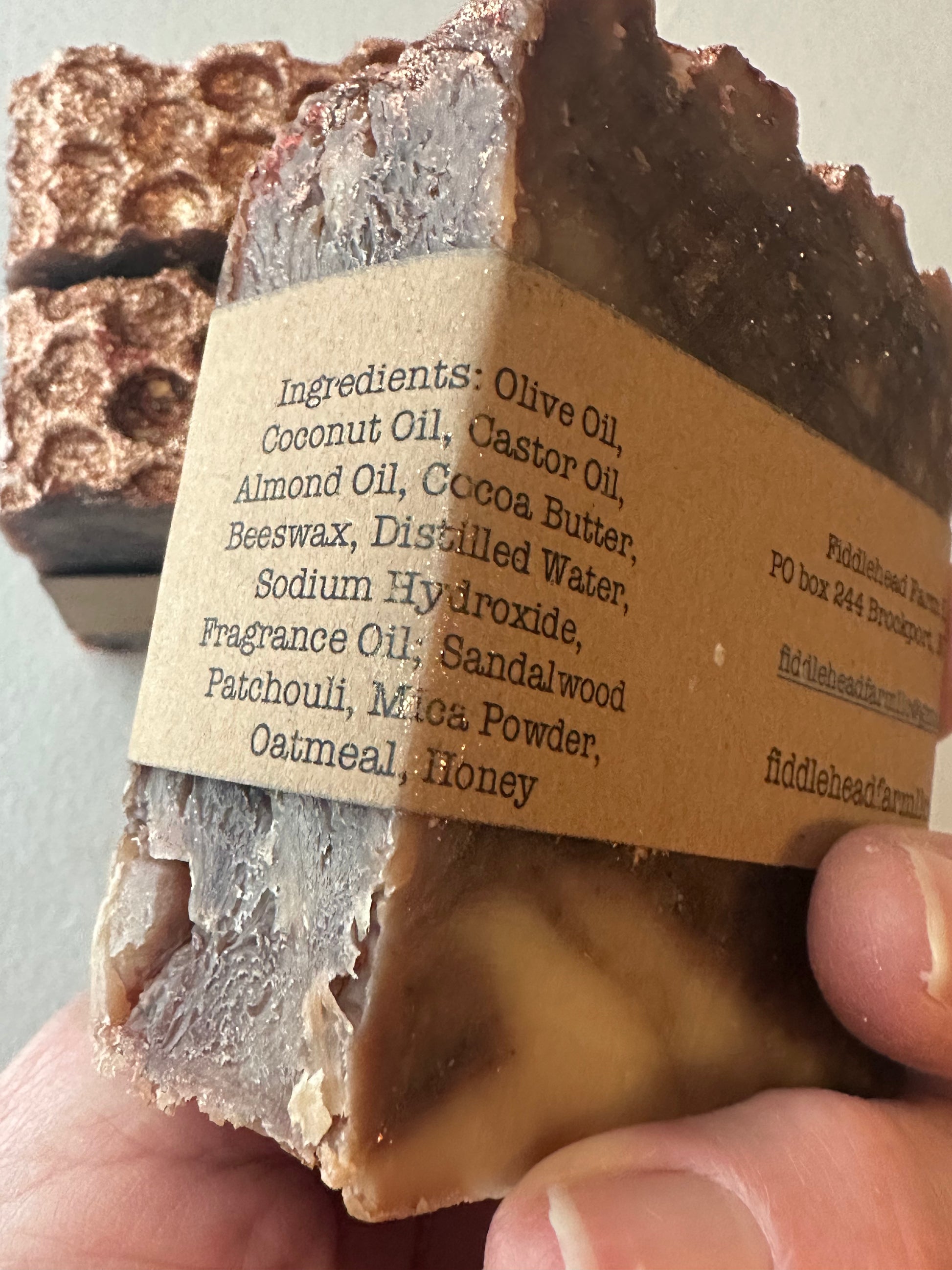 This bar contains rich butters and oils; olive oil, coconut oil, castor oil, almond oil, cocoa butter, beeswax, Sodium hydroxide, oatmeal, fragrance oil (sandalwood patchouli), mica powder, honey